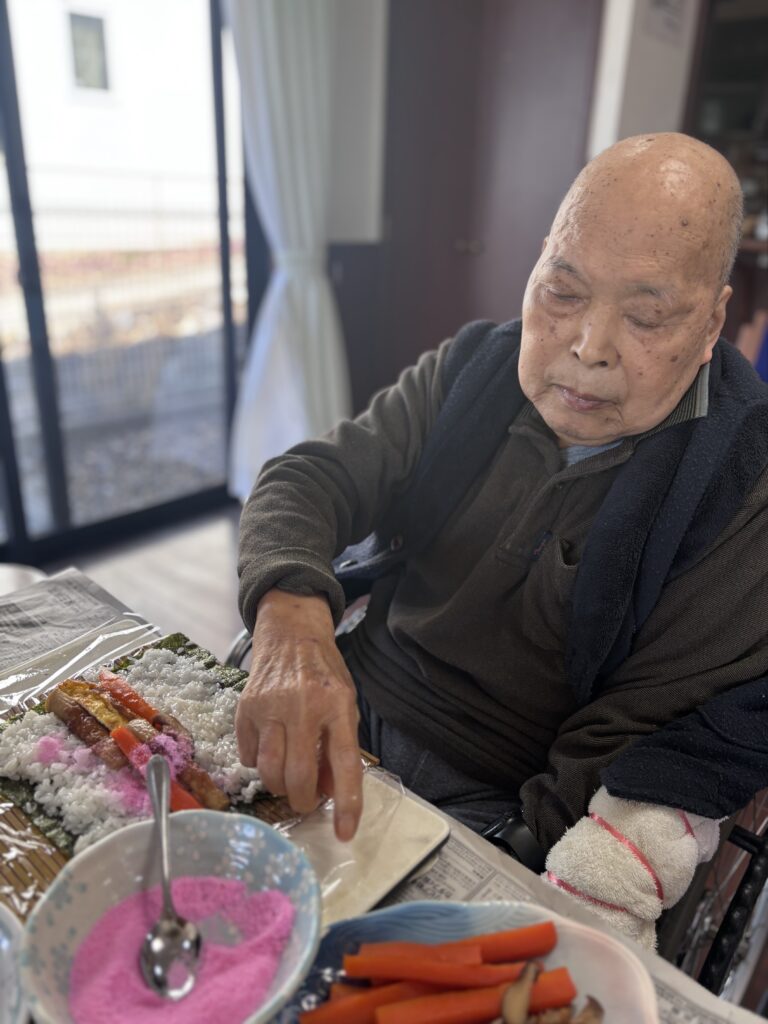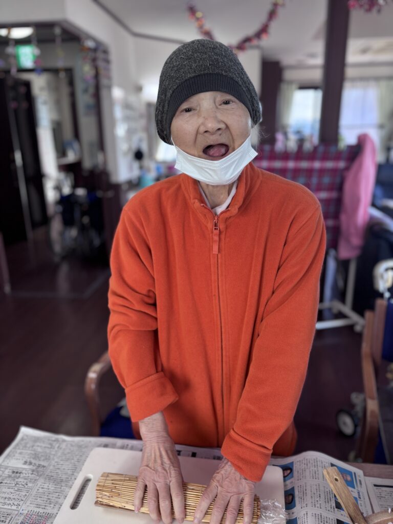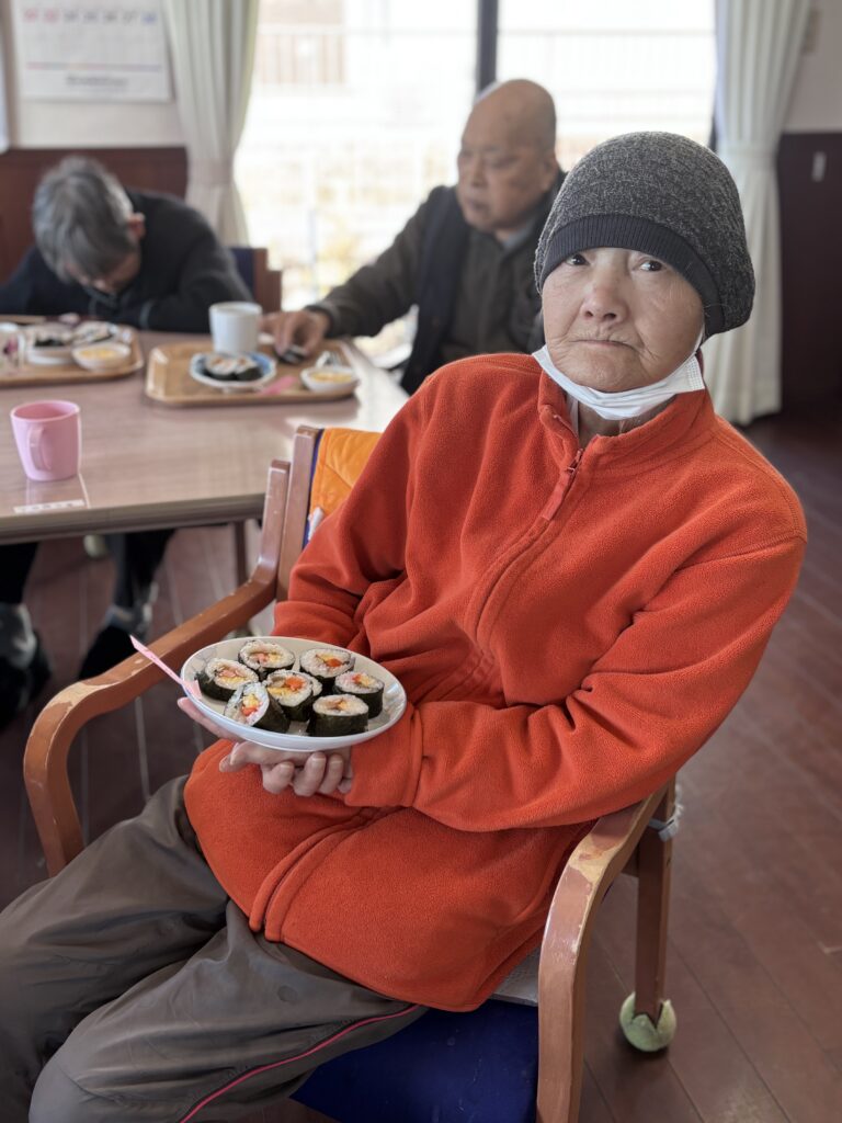 今年の節分は、恵方巻は職員で具材を作り、ご利用者様1人1人が好きな具を入れ、オリジナルの恵方巻を作って頂きました。太巻きの方、細巻きの方、人参をたくさん入れる方、入れない方、色んな恵方巻ができました🤣